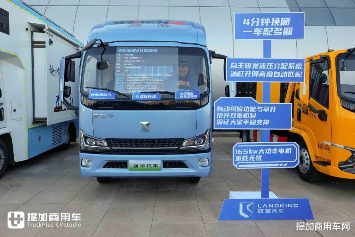 在国内,这一车型通常被称为“甩厢车”。其核心优势在于:一辆卡车可配备多个标准货厢循环使用,实现“人停车不停”,从而大幅提升车辆利用率和周转效率。甩下的货厢可直接作为临时仓储或分拣中心使用,缓解场地压力。同时,车辆与货厢分离也便于各自的维修、保养与灵活调度,整体运营灵活性显著增强。12月26日,以“科技蓝擎,向新加速度”为主题的潍柴新能源商用车2026科技创新大会在潍坊隆重举行。此次大会上,潍柴新能源商用车正式推出了蓝擎·悦EH甩厢车(下称蓝擎EH甩厢车)。该车主打4分钟快速换厢等核心技术,致力于构筑高效物流的核心竞争力。接下来,就让我们一起来详细了解这款车型。