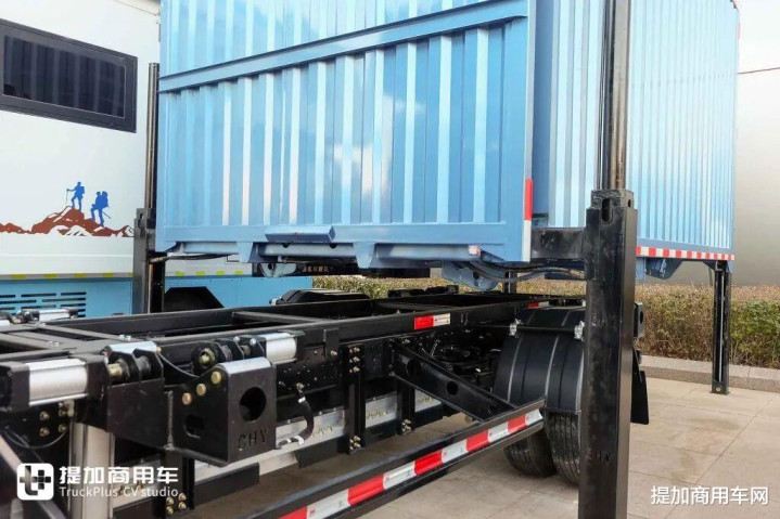 底盘上设计的滚轴系统可帮助纠正货厢位置,即使厢体与车辆底盘之间有部分偏移,也可借助该系统来实现货厢与底盘的精准对接,提升换厢成功率与作业流畅度。