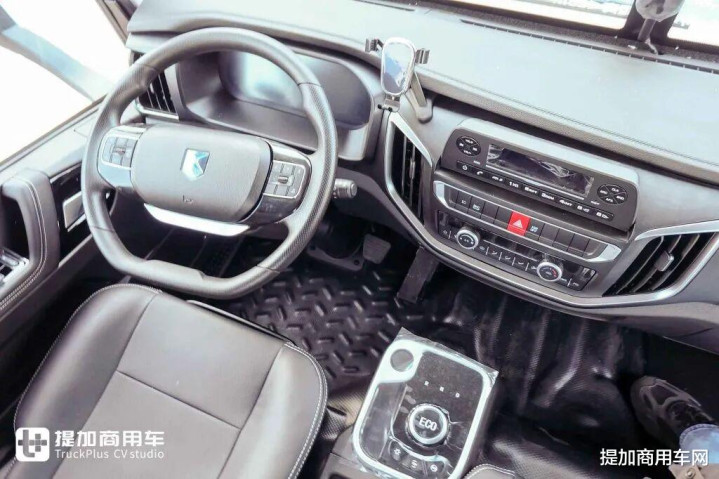 在良好的外观设计之下,蓝擎EH甩厢车的内饰也是极富科技感。车辆采用两幅式方向盘设计,底部削平,进而为驾驶员塑造更多空间。仪表盘运用全液晶显示,科技感进一步得到了提升。