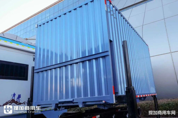 实拍蓝擎EH甩厢车采用潍柴新能源商用车原厂提供的货厢。这款货厢采用优质高强度钢材制造,表面工艺细腻,结构经过全面加强,能够适应高强度、多循环使用中的重载与摩擦挑战,进而延长使用寿命,降低维护频率与成本。